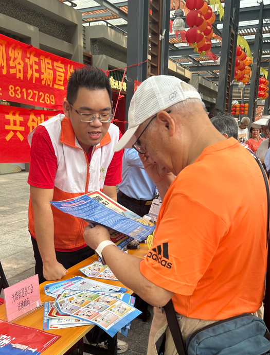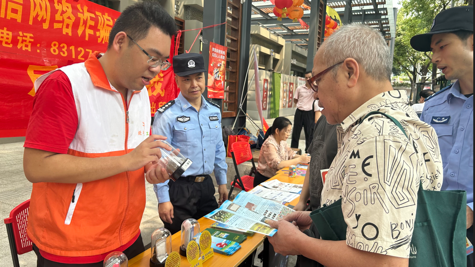 活动现场,社工通过摆放仿真模型、发放宣传手册等多种形式,向过往居民普及禁毒与防诈知识。宣传单上生动的案例、直观的图片,吸引了不少居民驻足观看。禁毒社工和民警热情地向居民介绍毒品的种类、特征及其对个人、家庭和社会的严重危害,提醒大家要时刻保持警惕,远离毒品诱惑。